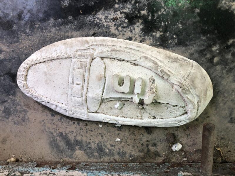 02_erstarrtes-weiss_schuh_blog-zufaelle-irene-jost 31.07. 2025# Streetart, Gips-Skulpturen, Schuh und Wort fin
